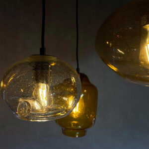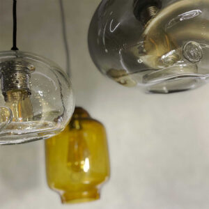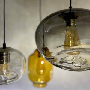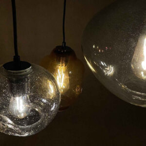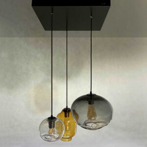 BAROQUE 3 gray is a chandelier made up of three handcrafted glass shades. The gray and transparency are contrasted with a warm, honey-colored shade, giving the composition character. The full shapes and color scheme of the chandelier evoke images from the Baroque era. The shades are suspended in space on aesthetic black cords with textile braids.