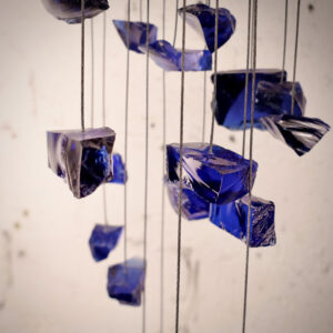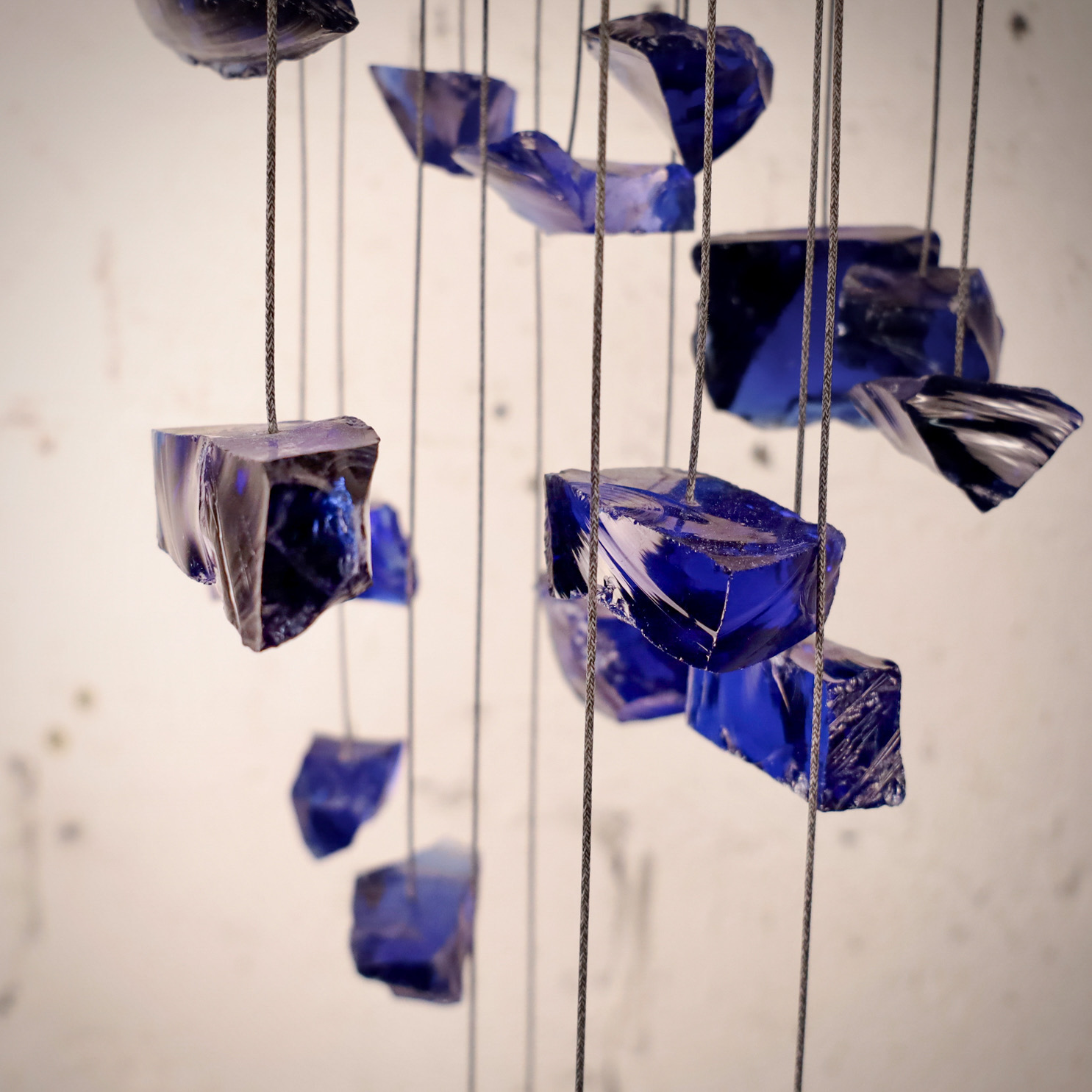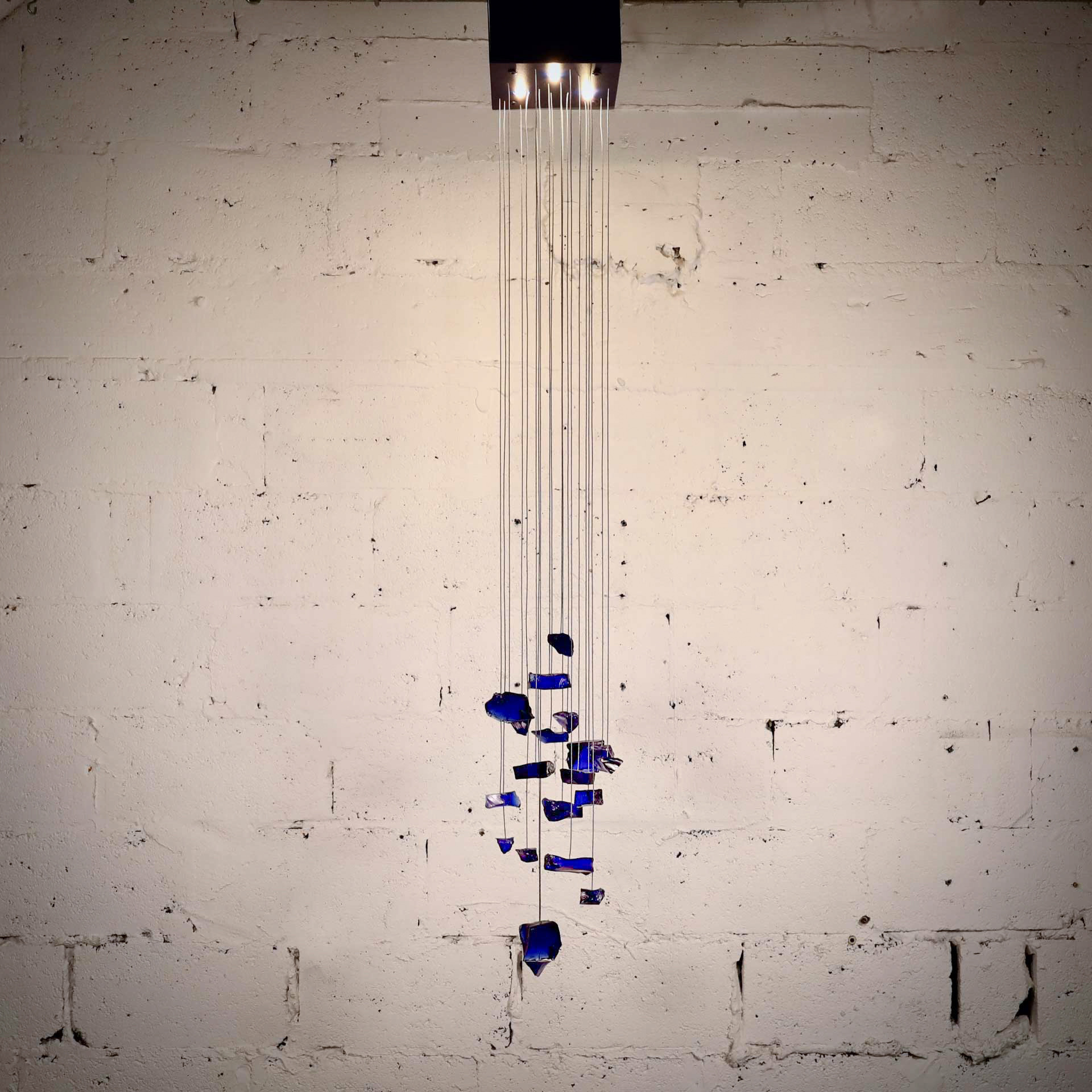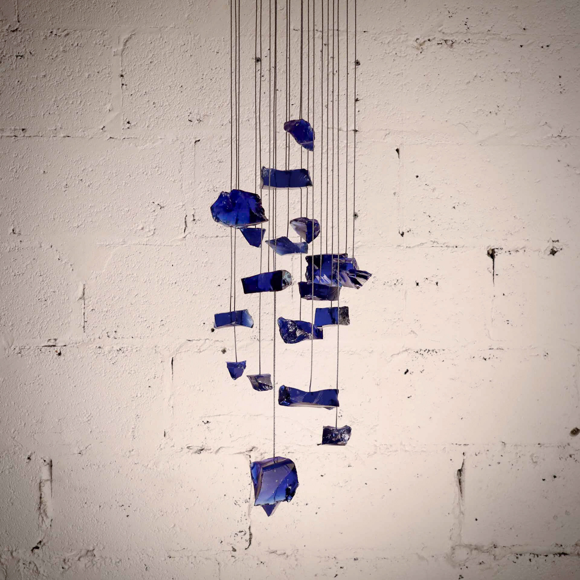 SAFIR 1 is the smallest and most delicate composition in the collection. It consists of twenty cobalt shards of fractured glass – irregular, varied in texture, sometimes perfectly smooth, sometimes softly opalescent. Its light and graceful form gives it an air of elegance, while the vivid hue of the glass adds character and depth.