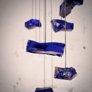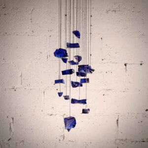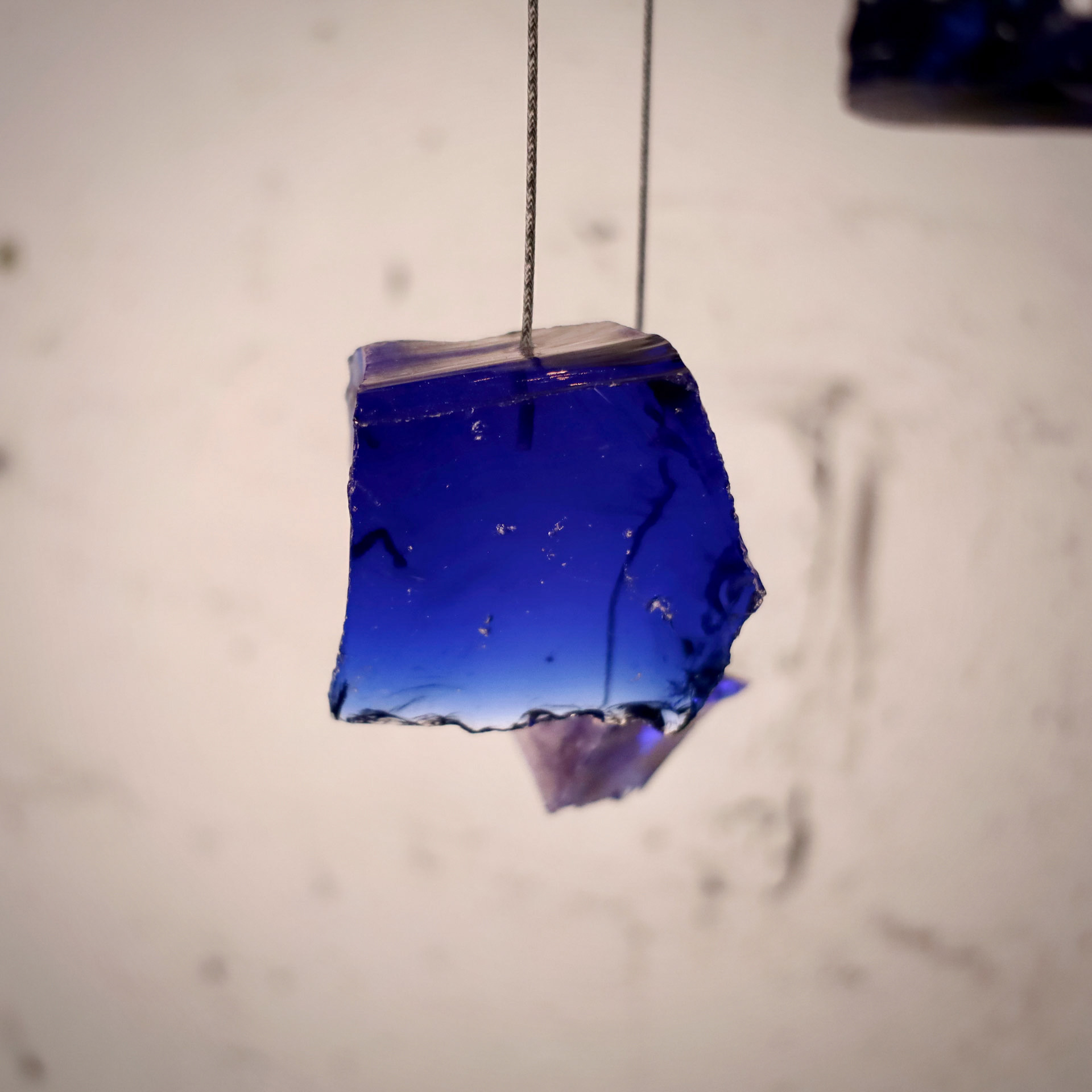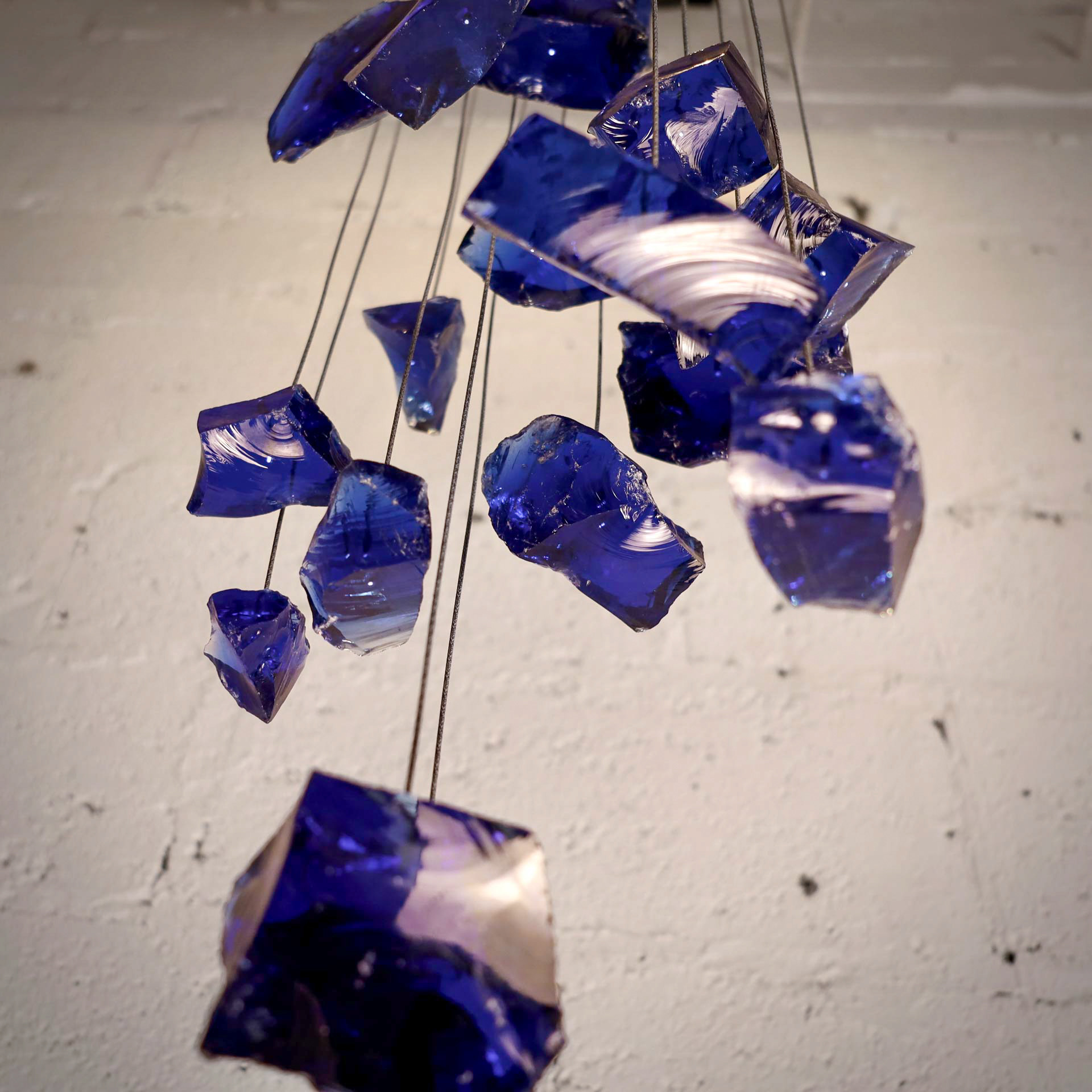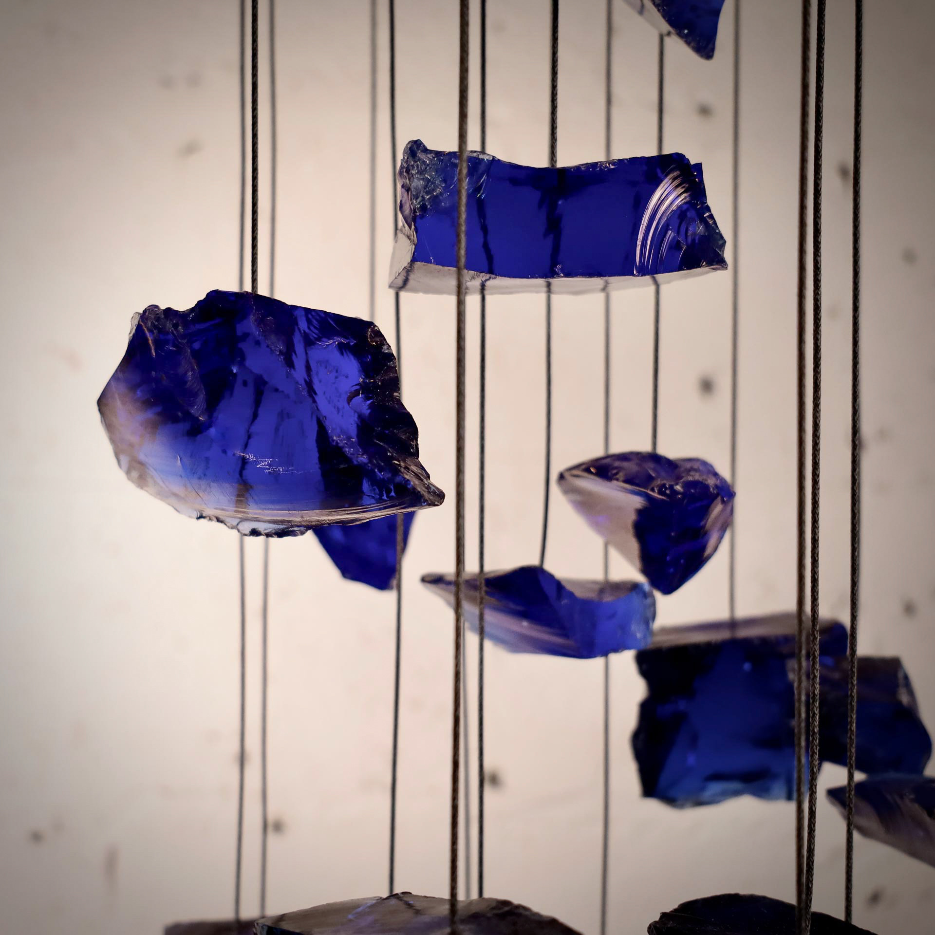 SAFIR 1 is the smallest and most delicate composition in the collection. It consists of twenty cobalt shards of fractured glass – irregular, varied in texture, sometimes perfectly smooth, sometimes softly opalescent. Its light and graceful form gives it an air of elegance, while the vivid hue of the glass adds character and depth.