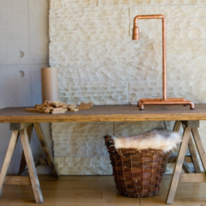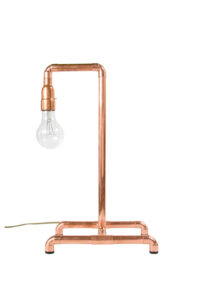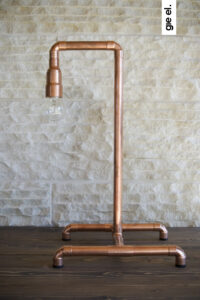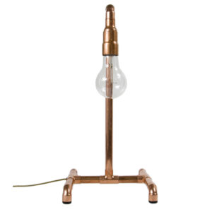 Lampa stołowa LANTERN IV miedziana to prostota formy zestawiona z prawdziwą miedzią. Cztery, stabilnie rozstawione nóżki, które schodzą się w centralnym punkcie podstawy. Do tego delikatna konstrukcja z miedzianych rurek i kolanek. Na końcu widoczna żarówka. Całość w surowym stylu. Miedziane elementy posiadają subtelne detale w formie oznaczeń numerycznych, które podkreślają industrialny charakter lampy.