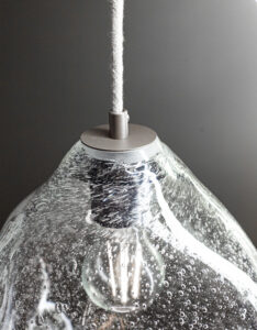 Ta szklana lampa z masywnego szkła to produkt premium, tworzony na zamówienie. Lampa wisząca BUBBLE jest tworzona ręcznie w Polsce. Rzemieślnikami odpowiedzialnymi za jej produkcję są hutnicy, którzy przy użyciu lanc wydmuchują każdy egzemplarz klosza. Przy jej produkcji nie wykorzystuje się drewnianych form. Lampa wykonywana jest w całości z ręki, dzięki czemu nie ma dwóch identycznych egzemplarzy.