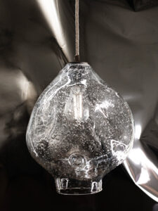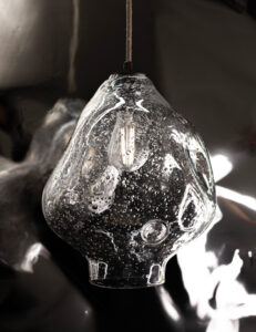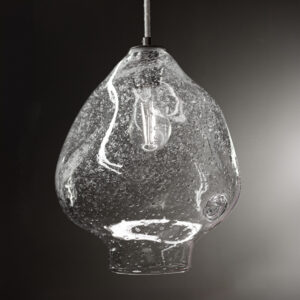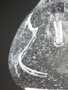 Transparentna lampa wisząca BUBBLE. Luksusowa i subtelna. Jej znakiem rozpoznawczym są zatopione w szkle pęcherzyki powietrza, swobodnie rozmieszczone, zdają się ulatywać z masywnego, ręcznie formowanego klosza.