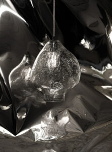 Zatopione w masywnym szkle, nieregularnie rozmieszczone pęcherzyki powietrza dodają transparentnej lampie wiszącej BUBBLE delikatności i wyjątkowości. Pęcherzyki przejmują barwę żarówki i rozchodzącego się światła, mieniąc się złotymi refleksami. Są niczym drobinki złota zatopione w powierzchni szkła. To lampa o niezwykłej, organicznej formie i wyjątkowej strukturze szkła.
