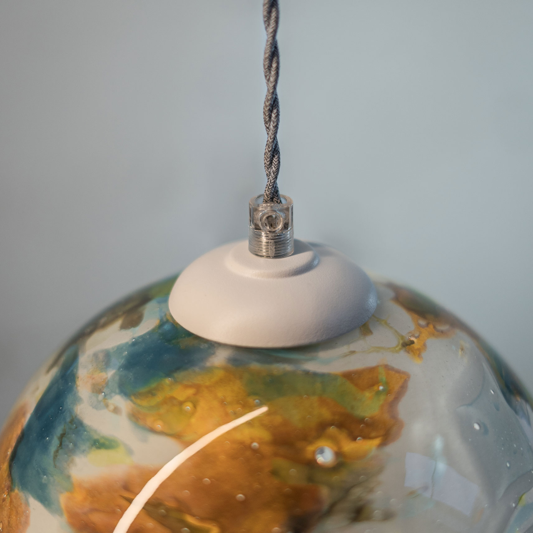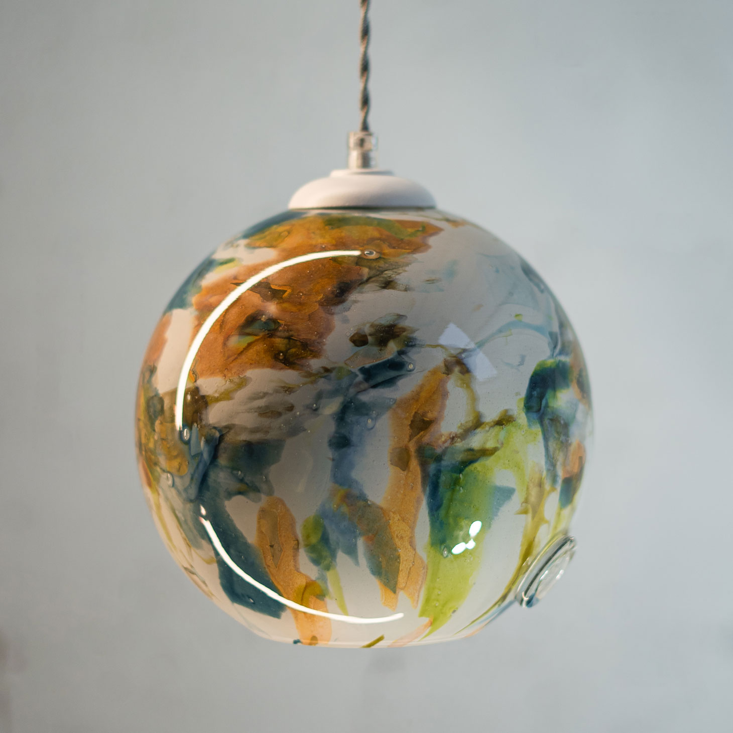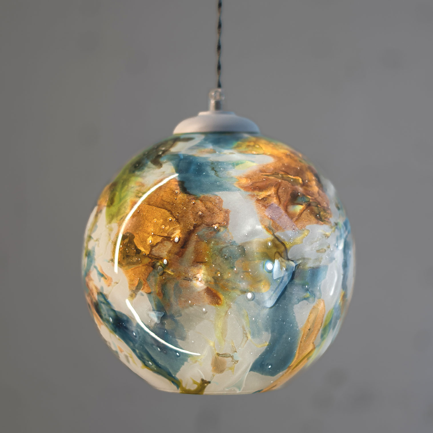 GALAXY III to elegancka lampa wisząca o mniejszym, kulistym kloszu. Wykonana z ręcznie formowanego szkła Pafil, pokrytego charakterystycznymi, impresjonistycznymi wzorami w pastelowych barwach. To propozycja dla osób, które szukają prostych, lecz unikatowych rozwiązań.