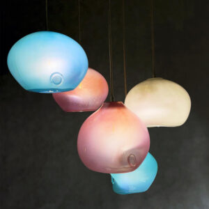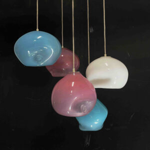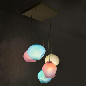 BALOON 5 to żyrandol stworzony dla osób, które nie lubią nudy i cenią sobie energię życia. Skomponowany z pięciu ręcznie wytwarzanych, pastelowych kloszy. Niesie w sobie uśmiech, którym chętnie się dzieli.