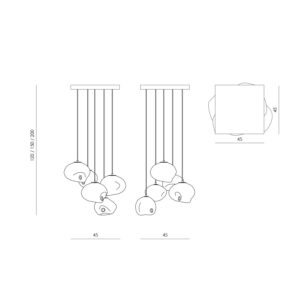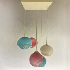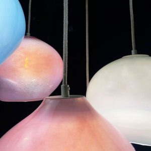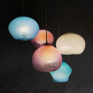 BALOON 5 to kompozycja pięciu ręcznie formowanych, szklanych kloszy o malowniczych, pastelowych kolorach. Organiczne, kuliste formy kloszy zwieszone są na tekstylnym oplocie w delikatnym, pastelowym kolorze. Forma kompozycji charakteryzuje się lekkością i finezją, która wpływa na artystyczny wyraz samego żyrandola. Dbałość o detale wyraźnie widoczna jest w doborze tekstylnego oplotu, odcieniach kolorystycznych samego szkła oraz widocznego na każdym kloszu loga Gie El, które świadczy o autentyczności żyrandola