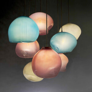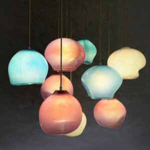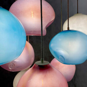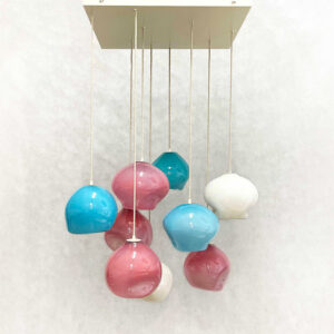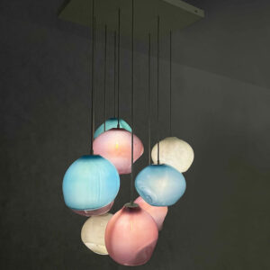 BALOON 9 to żyrandol stworzony dla osób, które nie lubią nudy i cenią sobie energię życia. Skomponowany z dziewięciu ręcznie wytwarzanych, pastelowych kloszy. Niesie w sobie uśmiech, którym chętnie się dzieli.