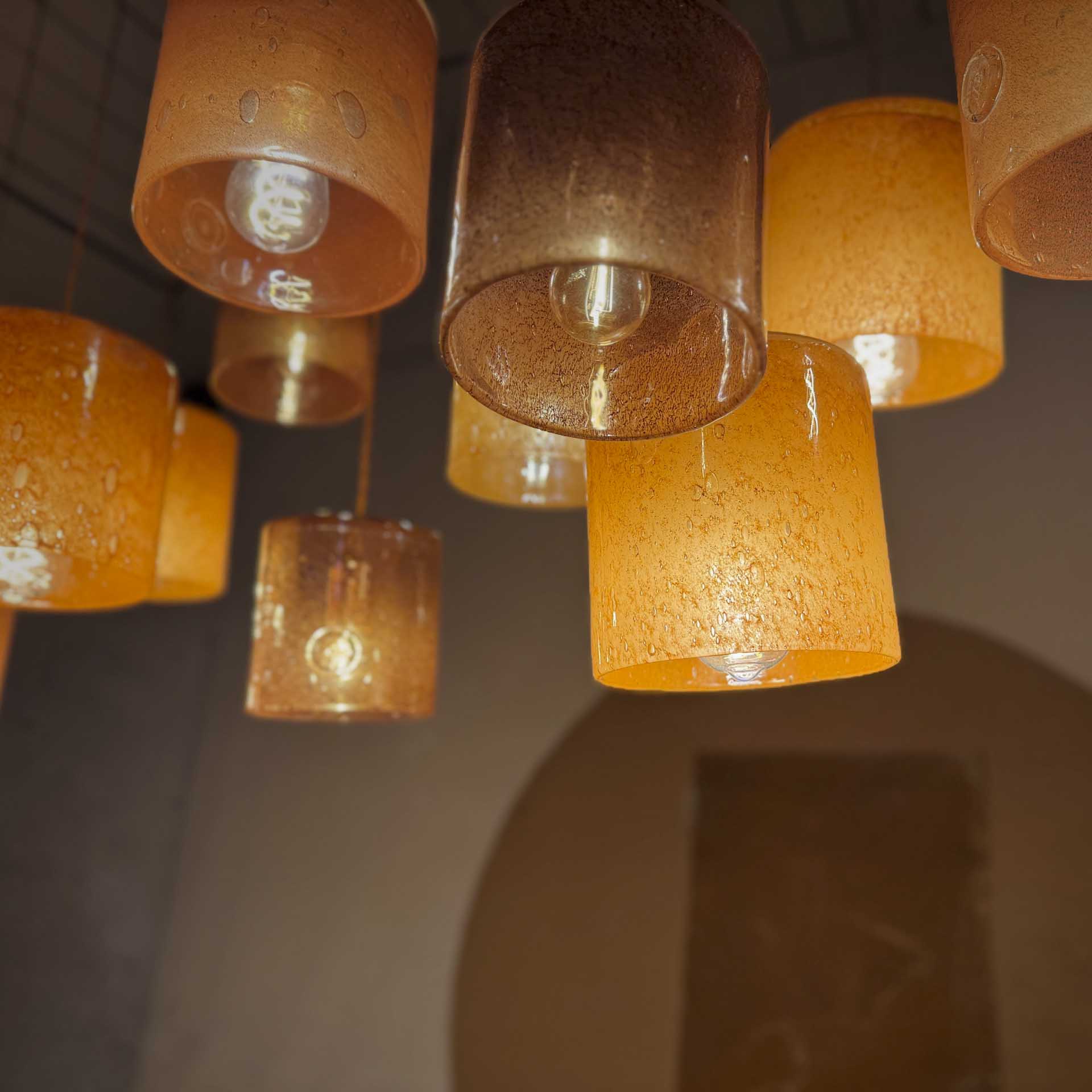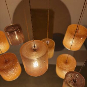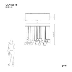 CANDLE 15 to obfita i bardzo frywolna kreacja świetlna, daleka od wkładania w ramy. W ciągu dnia swoim kolorem i dynamiką może nasuwać na myśl muzykę południową, w której szklane klosze nadają rytm, wibrują, układają się w bardzo charakterystyczny dla siebie sposób. Natomiast po zmroku, klosze zyskują zupełnie inną aurę energetyczną – trochę tak, jakby ktoś rzucił zaklęcie i kazał im się unieść. Wówczas CANDLE 15 zamienia się w instalację złożoną z lewitujących w powietrzu, nastrojowych świec, tworząc we wnętrzu nastrojową, ciepłą aurę, podobną do tej, która pojawia się przy rozpalonym kominku.