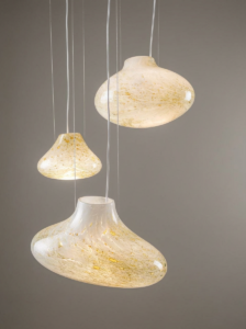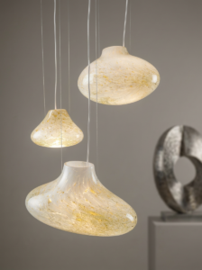 Każdy z trzech kloszy CLOUDS 3 posiada własną formę i proporcje, dzięki czemu kompozycja pozostaje dynamiczna i naturalna. Światło wprowadzone do wnętrza szklanych form przenika przez mleczną strukturę szkła i delikatnie rozprasza się wokół lampy, wydobywając subtelne niuanse kolorystyczne.