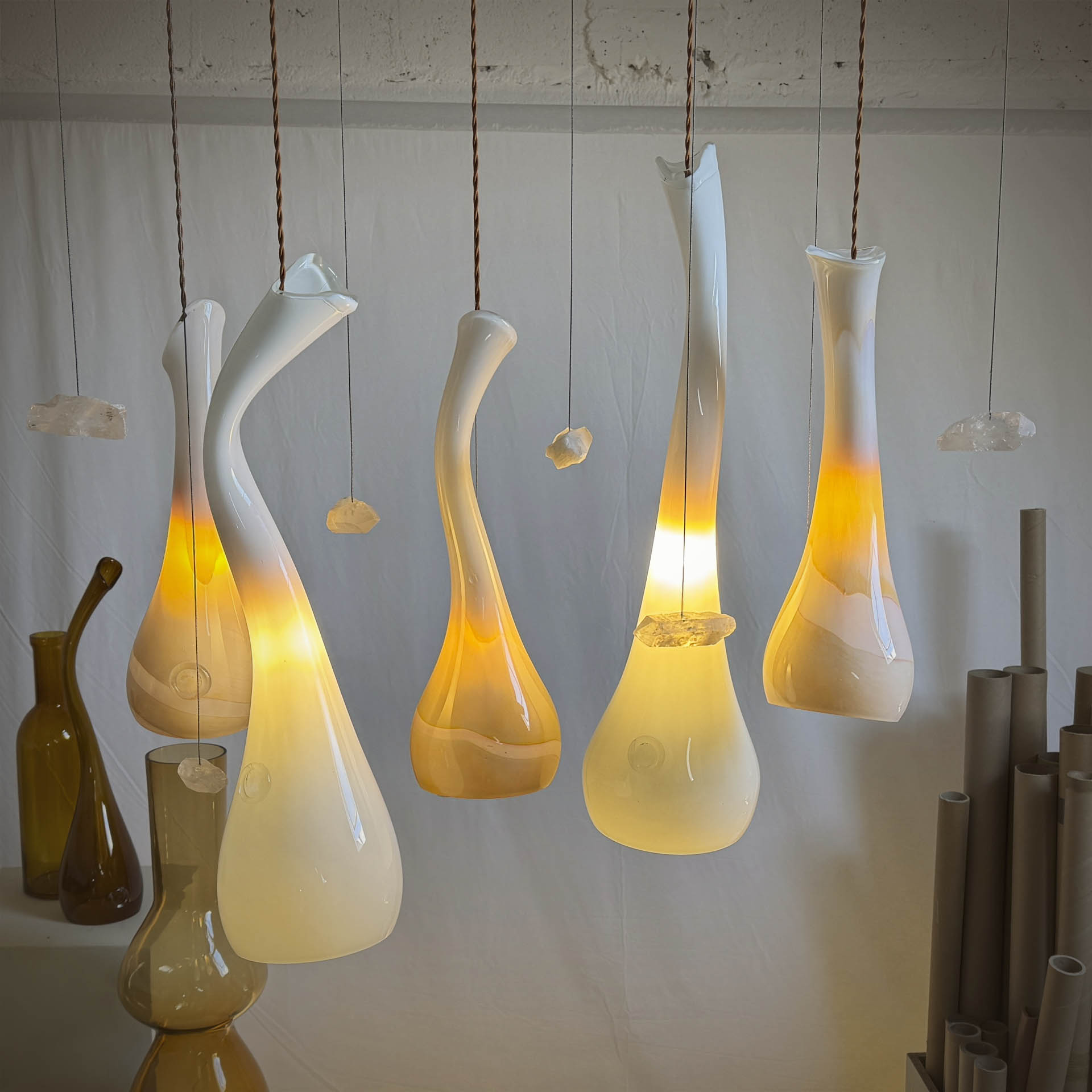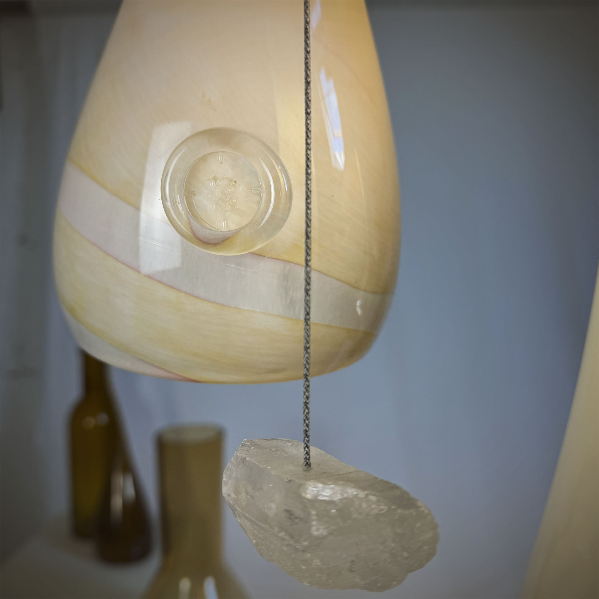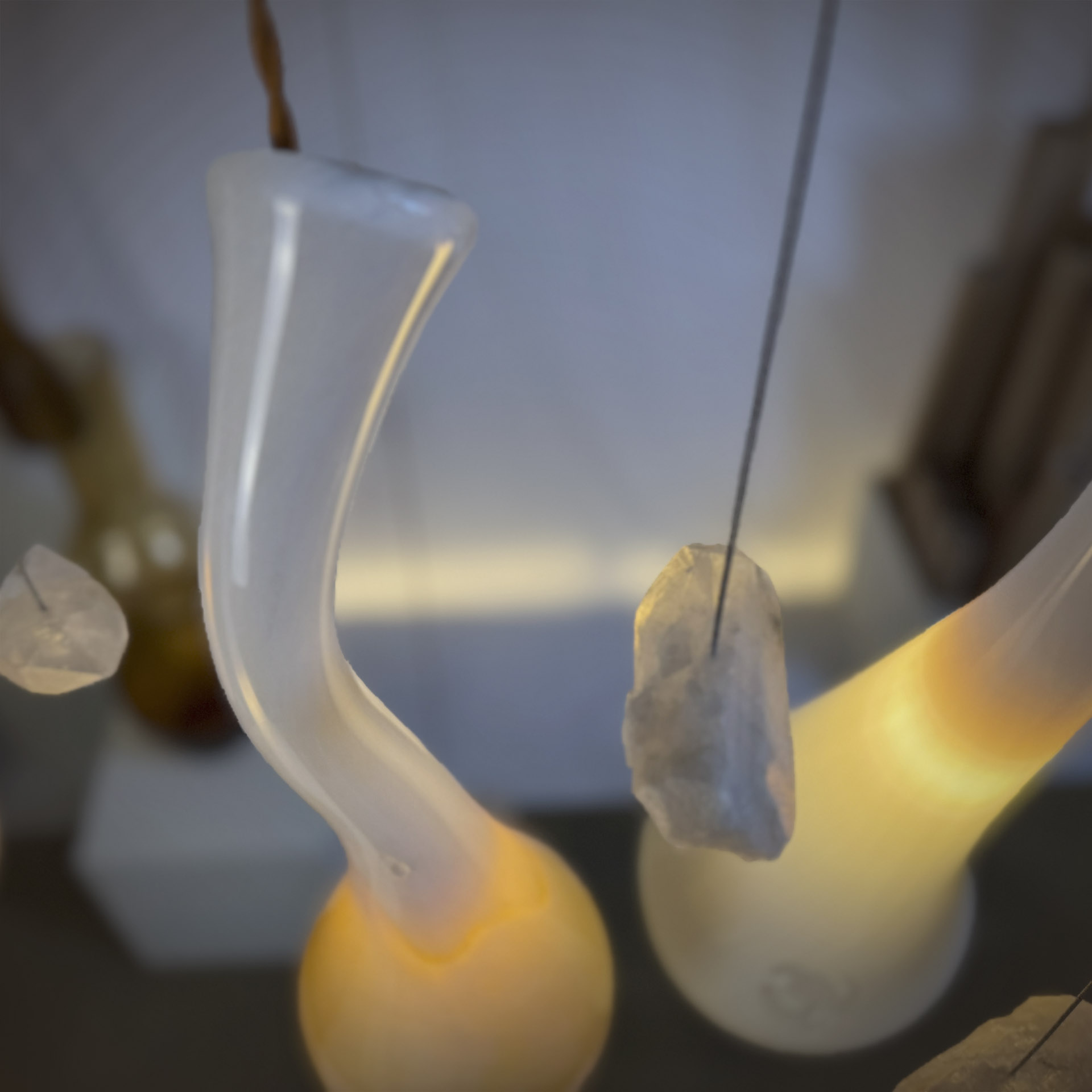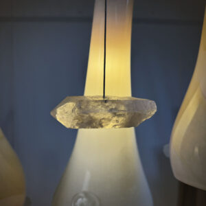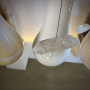 Kompozycję miękkich w wyrazie kloszy wzbogacają naturalne, nieregularne kryształy górskie, które unoszą się pomiędzy szklanymi “wydmami” niczym gwiazdy nad pustynią. Całość dopełnia miedziano-brązowy przewód w oplocie, który współgra z temperaturą kloszy i dodaje kompozycji szlachetnej głębi. DIUNA to jedyny na świecie egzemplarz i ściśle określony projekt, natomiast atrybuty takie jak: wysokość żyrandola, sposób mocowania go do sufitu oraz kolor podsufitki mogą zostać dostosowane do indywidualnych potrzeb. Stąd trzytygodniowy czas na realizację zamówienia.