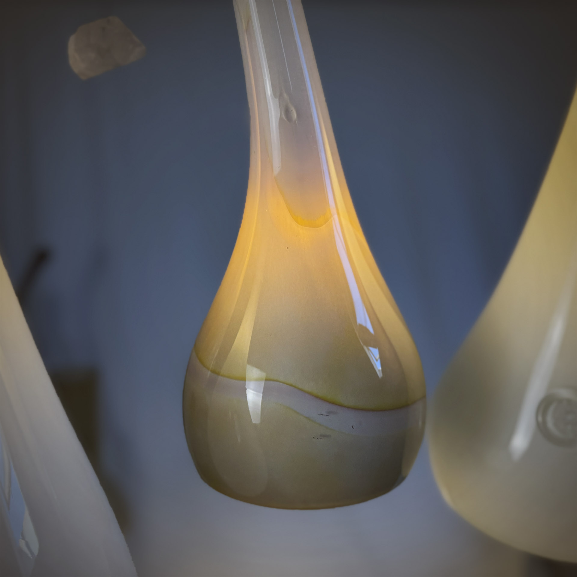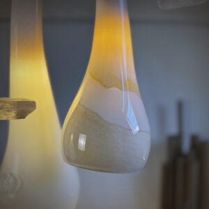 W świetle dziennym część kloszy DIUNA jest biała, a część ma w sobie domieszkę piaskowego pigmentu zatopionego w szkle. Pigment rozchodzi się po ich gładkiej strukturze falowo, jakby niesiony podmuchami pustynnego powietrza. Pod koniec dnia, gdy włącza się światło żarówki, jasne klosze przybierają głęboko złotą barwę, przypominającą pustynny piasek o zmierzchu. Stają się jasne, świetliste, jeszcze bardziej podkreślając subtelność swojej formy.