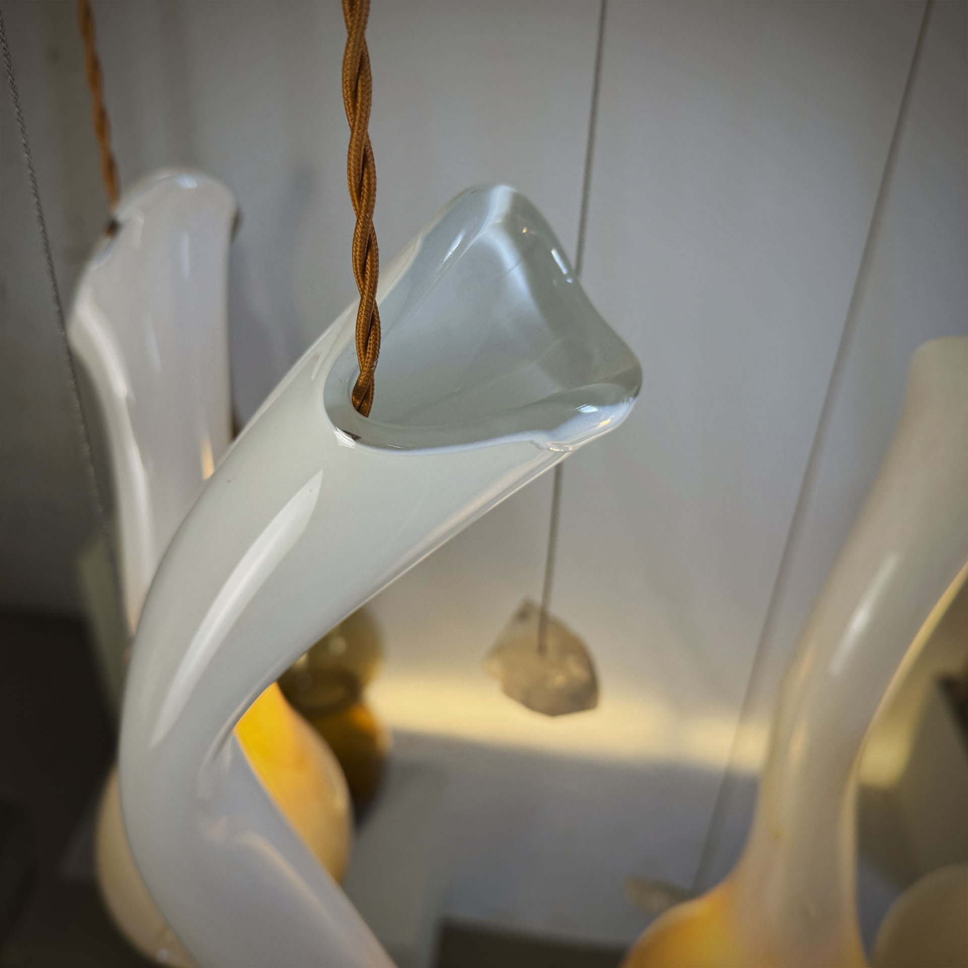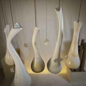 Żyrandol DIUNA to opowieść o pustyni. Fantazyjne, ręcznie formowane klosze o organicznych, płynnych liniach przypominają smukłe sylwetki wielbłądów. Ich wydłużone szyje i łagodnie zaokrąglone kształty przywołują też skojarzenia ze smukłymi formacjami skalnymi lub wydmami, których linie zostały ukształtowane przez wiatr.