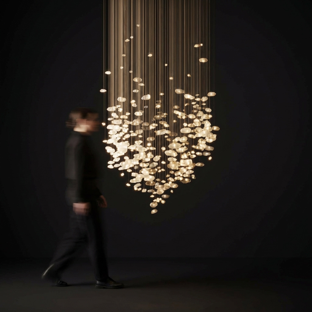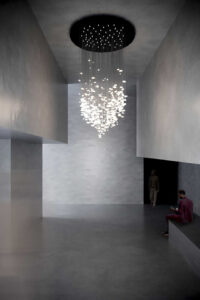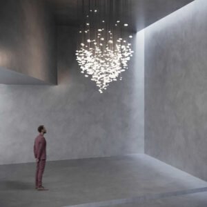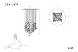 GENIUS 9 składa się z prawie czterystu kryształów górskich. Z wnętrza każdego kryształu wydobywa się subtelne światło odkrywające tajemnicę szlachetnego, ale surowego kamienia. Mnogość kamieni w eliptycznej strukturze staje się centralnym punktem w każdym wnętrzu. GENIUS 9 czerpie inspirację z tradycyjnych żyrandoli, lecz prezentuje je w nowoczesnym kontekście. To żyrandol rzeźba, który został stworzony do imponujących, minimalistycznych przestrzeni, w których przejmie dominującą rolę. Jego celem jest wywoływanie emocji i wzbogacenie przestrzeni.
