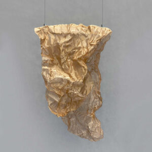 Złoty MESH 1 to futurystyczny żyrandol o organicznym kształcie, przypominający nowoczesną rzeźbę. Żyrandol jest wykonany ze stalowej siatki po której rozchodzi się światło, tworząc na jego nieregularnej powierzchni artystyczne światłocienie.