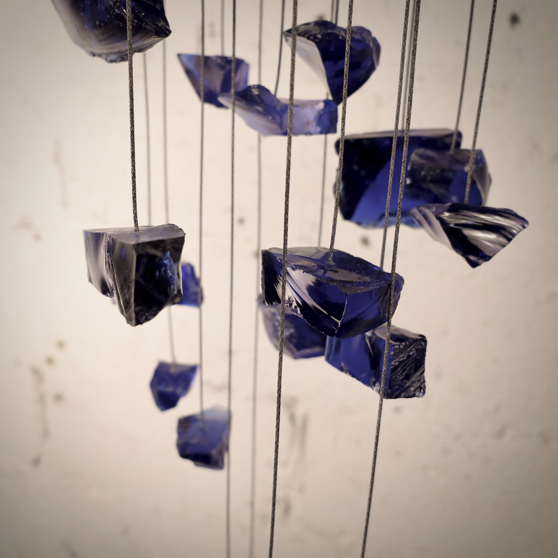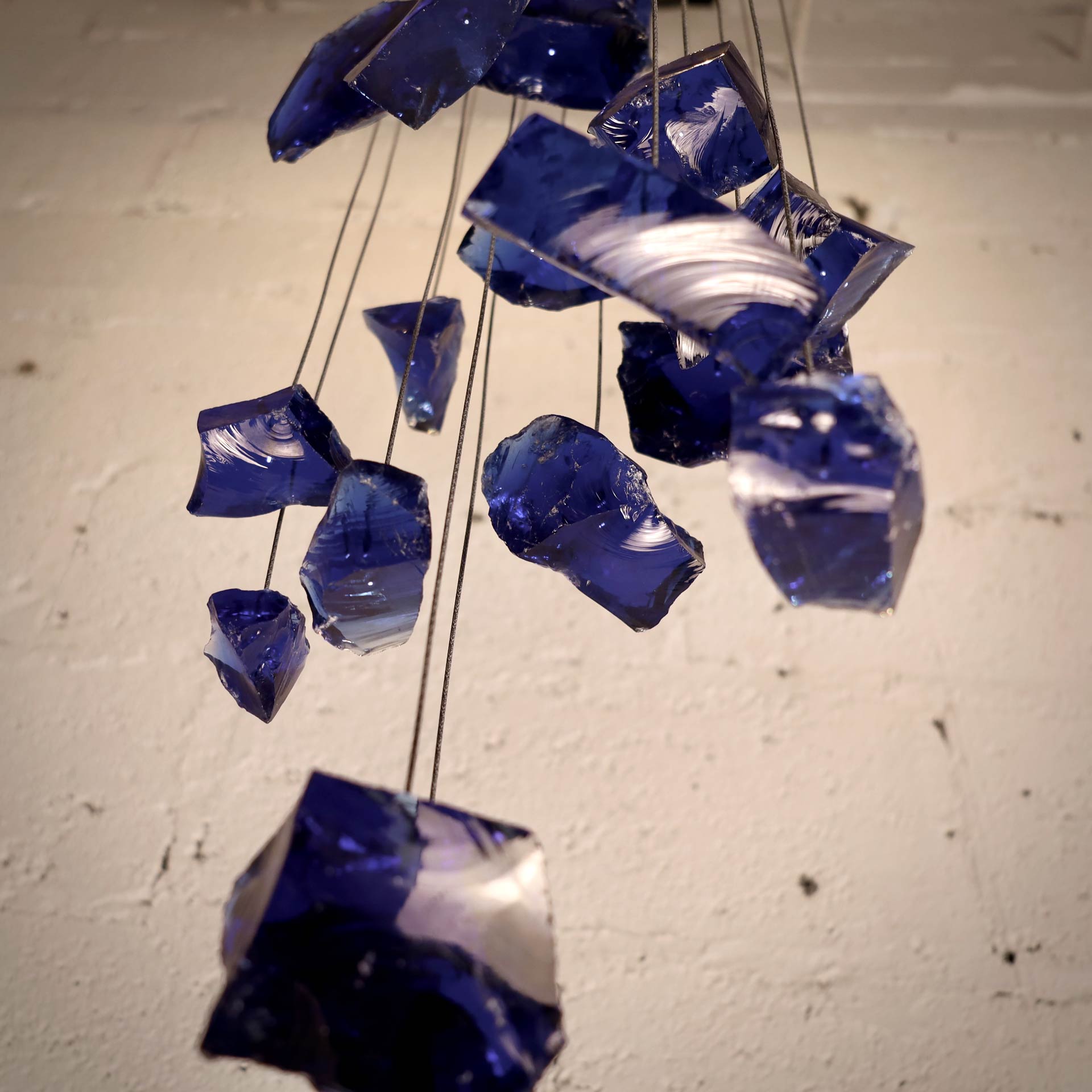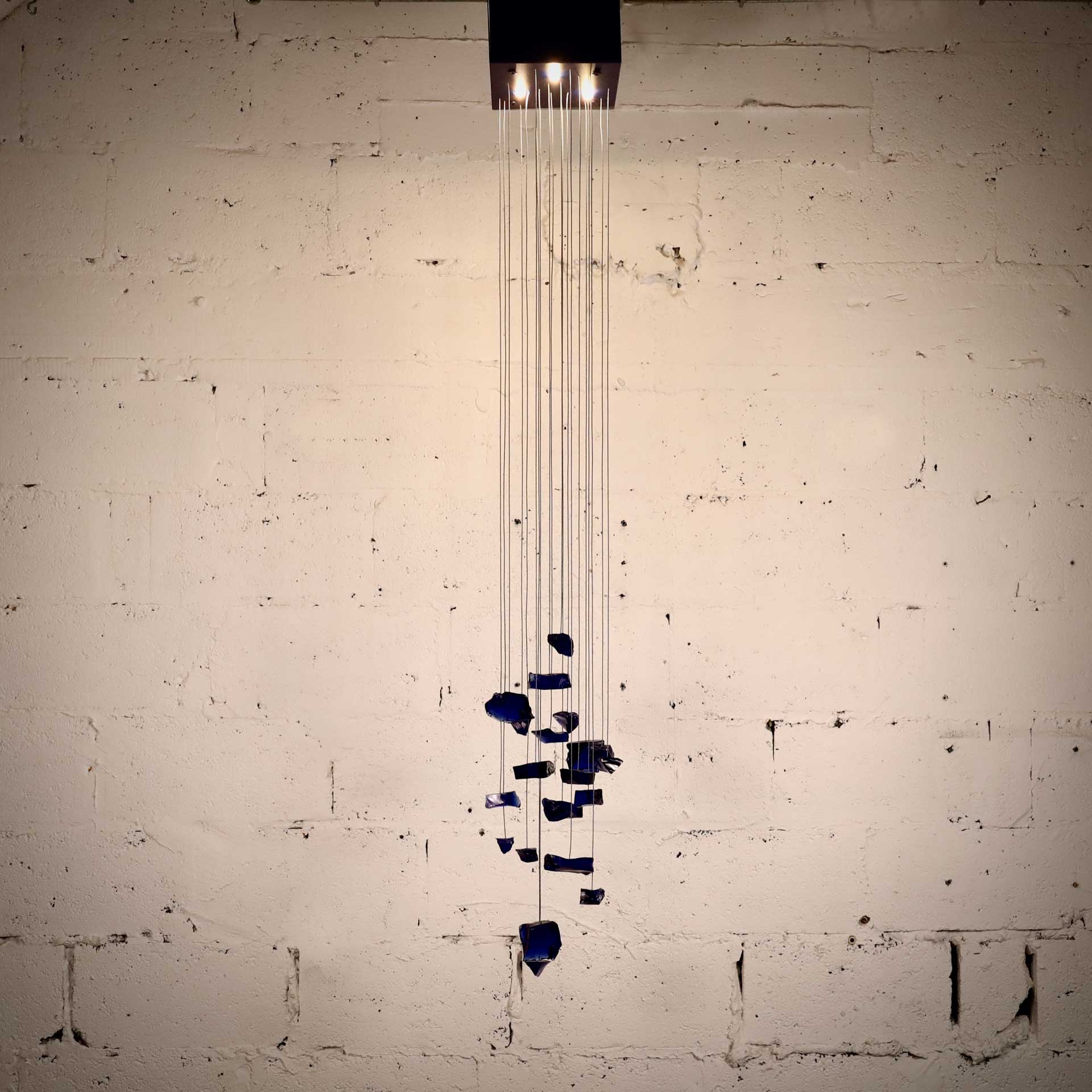 Żyrandol SAFIR 1 to najmniejsza, najbardziej subtelna kompozycja z kolekcji. Składa się z dwudziestu kobaltowych bryłek łamanego szkła – nieregularnych, zróżnicowanych w strukturze, czasem idealnie gładkich, czasem z mleczną poświatą. Delikatna forma żyrandola sprawia, że całość wygląda lekko i elegancko, a intensywny kolor szkła dodaje jej wyrazistości.
