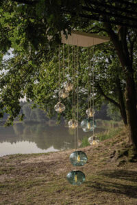 Żyrandol UNDER_C składa się z trzech dużych, naturalnie zaokrąglonych szklanych kloszy w kolorze hipnotyzującej turkusowej zieleni. Towarzyszy mu sześć mniejszych kloszy o przezroczystej barwie. Wszystkie wypełnione pęcherzykami powietrza zamkniętymi w grubej warstwie prawdziwego szkła. Kompozycję żyrandola uzupełniają unoszące się niczym mewy, łamane trójkąty w kremowym odcieniu.