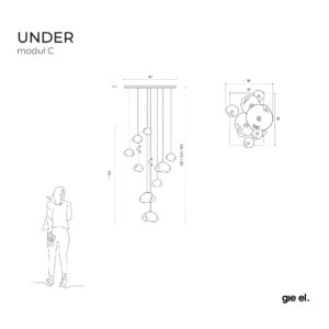 Żyrandol UNDER_C to propozycja dla osób o wysokiej wrażliwości, poszukujących niepowtarzalnych elementów wyposażenia do swojego wnętrza. Wyjątkowość UNDER_C uwidacznia się, gdy światło zaczyna wypełniać pomieszczenie, nadając mu malowniczy charakter. Żyrandol stanowi nie tylko piękne uzupełnienie przestrzeni, ale także przyciągający wzrok akcent, który delikatnie wpisuje się w otoczenie. Do produkcji kloszy używane są hutnicze piece rozgrzewane do temperatury tysiąca stopni. Gorące szkło jest dmuchane i kształtowane w organiczne, zaokrąglone formy, z których każdy jest wyjątkowy.