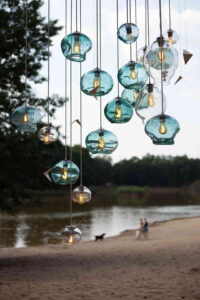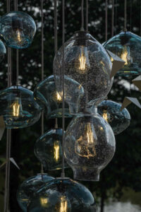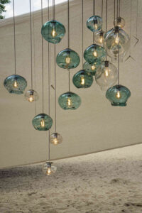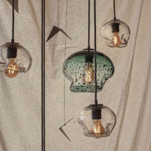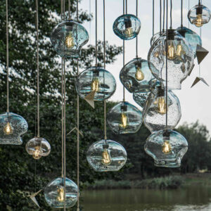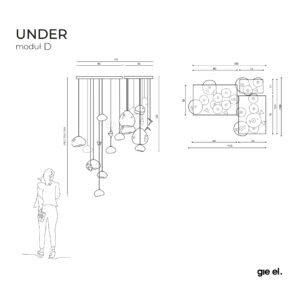 Żyrandol UNDER_D to kompozycja zaprojektowana z mniejszych modułów żyrandoli UNDER. Składa się z osiemnastu szklanych kloszy, których odcienie turkusowej zieleni przenikają się z bezbarwnymi. Wszystkie klosze wypełnione są pęcherzykami powietrza zamkniętymi w grubej warstwie prawdziwego szkła. Kompozycję żyrandola uzupełniają unoszące się niczym mewy, łamane trójkąty w kremowym odcieniu.