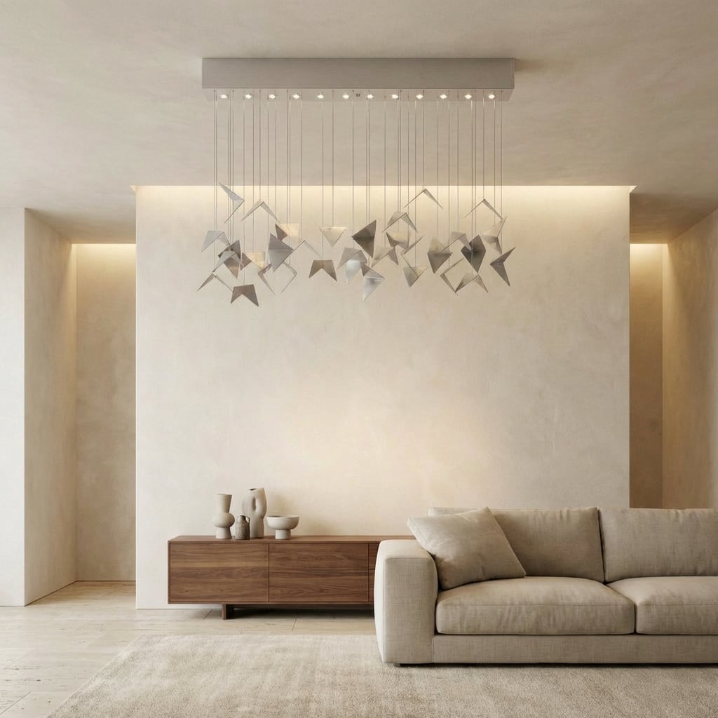 Powietrzna instalacja ubrana w dobrze skrojone wzornictwo. Designerski żyrandol VILINE 2 kremowy zachwyca swą harmonijną formą, dynamiką kształtów i świeżością zawieszonych w przestrzeni, kremowych elementów.