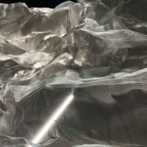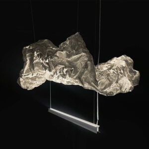 Ulotny i hipnotyzujący. Srebrny żyrandol VISION 160 cm unosi się w powietrzu niczym powiewająca na wietrze wstęga zastygła w ruchu. Instalacja zaprojektowana tak, by otulić wnętrze miękkim, ciepłym światłem i dodać mu artystycznego ducha.